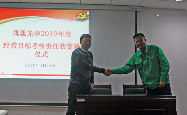 1月16日,鳳凰光學股份有限公司在科研樓一樓會議室召開2018年度經營工作總結會暨2019年責任狀簽署會議。鳳凰股份黨委書記、董事長劉翔,總裁劉銳,高級副總裁繆建新、高波,黨委副書記、副總裁熊詩雄,副總裁王煒,黨委副書記、紀委書記、工會主席羅躍忠,鳳凰股份中層以上干部以及鳳凰科技經理級以上人員共50余人參加會議。