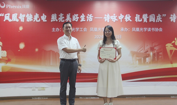 為豐富職工文化生活,塑造鳳凰光學(xué)全新的企業(yè)形象,激發(fā)廣大干部職工的責(zé)任感和創(chuàng)新意識,宣講鳳凰光學(xué)企業(yè)文化核心理念,9月13日晚,由鳳凰光學(xué)工會、團委主辦,讀書協(xié)會承辦的“鳳凰智能光電,照亮美好生活—詩詠中秋,禮贊國慶”詩文朗誦比賽在科研大樓一樓會議室順利召開。鳳凰股份黨委副書記、鳳凰控股董事長王俊,鳳凰股份紀委書記、工會主席羅躍忠等參加活動,并為獲獎選手頒獎。