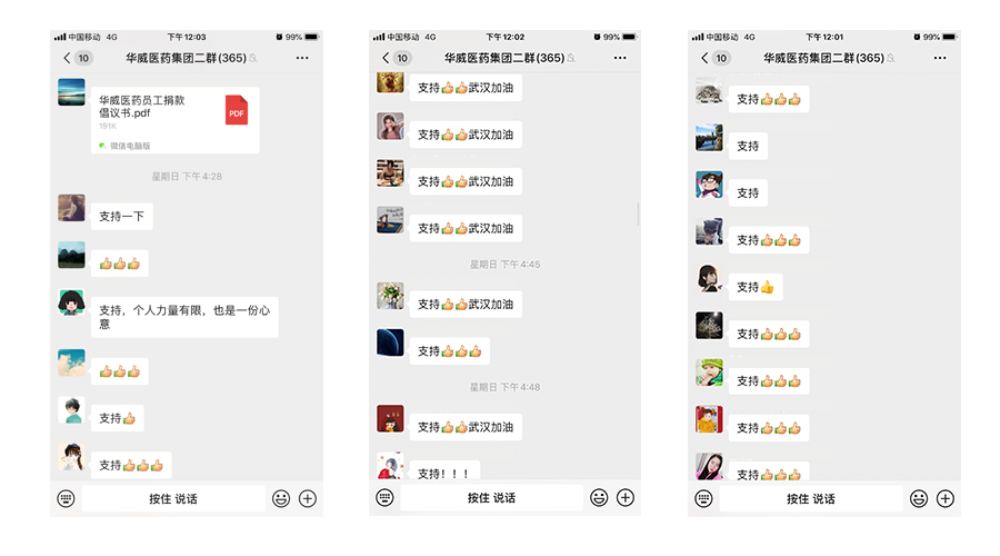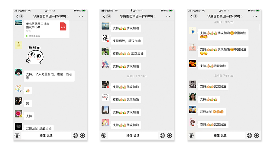 2020年2月9日上午,由南京華威醫藥集團工會委員會發起的“開門紅包”捐贈活動一經開始,就迅速在公司微信群中得到廣大員工們的熱烈響應! “我支持!我馳援!””加油武漢“加油中國”...,小伙伴們紛紛表示愿意取消開門紅包活動,將每年寓意吉祥喜樂的100元開門紅包捐獻出去,為抗擊疫情貢獻自己的一份力量,雖然金額不多,但是心意滿滿!