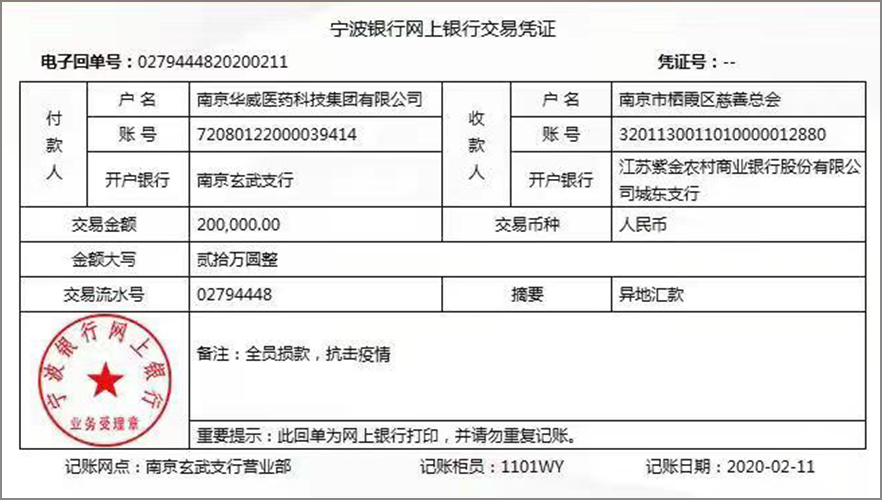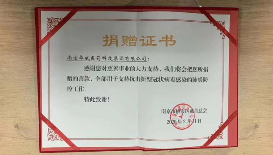 除了800余名華威員工捐出的價值8萬元的開門紅包外,華威醫藥集團自身捐出12萬元,共計20萬元現金,統一捐贈給棲霞區慈善協會用于疫情防控!此外,華威醫藥在各種抗疫物資匱乏的當下,春節假期間,歷經重重困難采購了價值10余萬元的抗疫物資,在保障安全的前提下,第一時間送往受捐單位,為江蘇省抗擊新型冠狀病毒感染肺炎疫情貢獻自己的一份力量。同時,表達了民眾的責任心以及愛心企業的大愛之心!