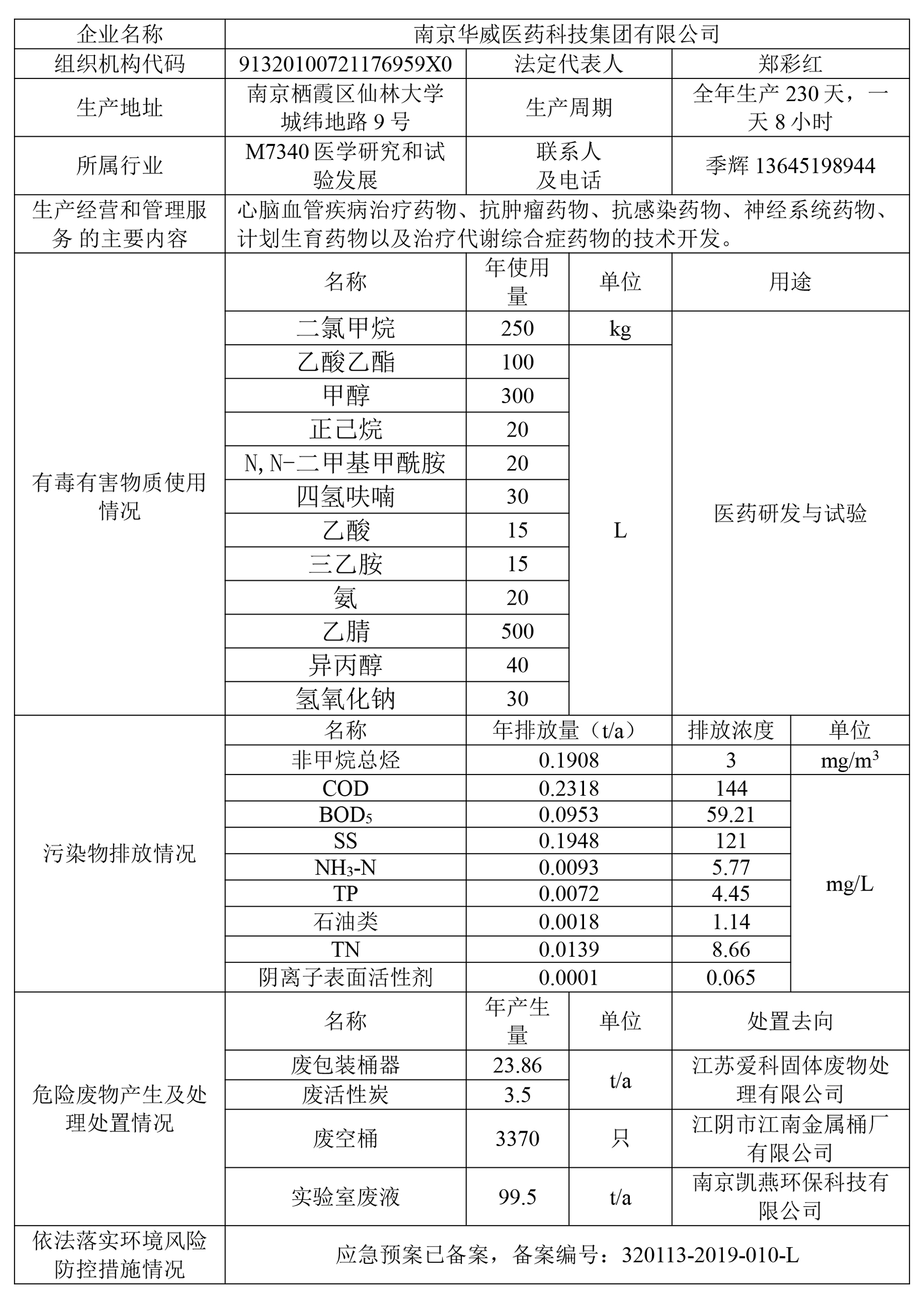 南京華威醫藥科技集團有限公司清潔生產審核環境信息公開表