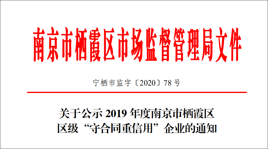 近日,為進(jìn)一步推進(jìn)企業(yè)誠(chéng)信建設(shè),規(guī)范企業(yè)合同行文,引導(dǎo)企業(yè)誠(chéng)信履約、守法經(jīng)營(yíng)。根據(jù)《南京市市級(jí)守合同重信用企業(yè)公示辦法》 的相關(guān)規(guī)定,南京市棲霞區(qū)市場(chǎng)監(jiān)督管理局特向社會(huì)公示,確定南京華威醫(yī)藥科技集團(tuán)有限公司等101家企業(yè)入選 2019 年度南京市棲霞區(qū)區(qū)級(jí)“守合同重信用”企業(yè)。