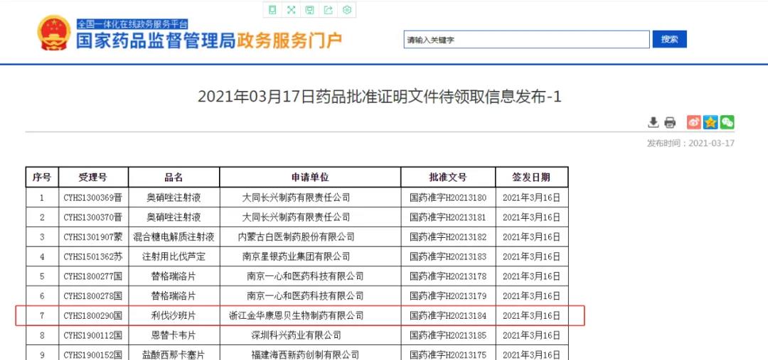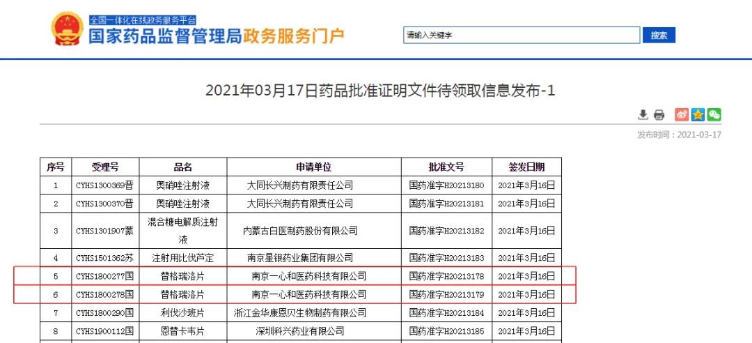 2021年3月16日,國(guó)家藥品監(jiān)督管理局正式發(fā)布通知,華威醫(yī)藥受南京一心和醫(yī)藥科技有限公司委托的替格瑞諾片(90mg、60mg)項(xiàng)目正式通過(guò)審評(píng)審批,獲得生產(chǎn)批件。