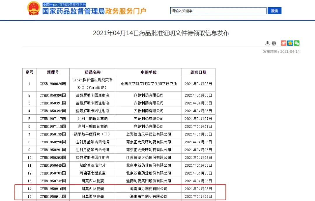 2021年4月6日,國(guó)家藥品監(jiān)督管理局正式發(fā)布通知,特一藥業(yè)集團(tuán)有限公司分公司海南海力制藥有限公司申報(bào)的阿莫西林膠囊(0.25g、0.5g)正式通過(guò)仿制藥質(zhì)量和療效一致性評(píng)價(jià)。