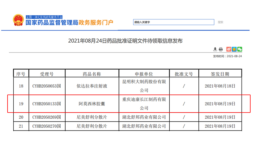 2021年8月19日,國家藥品監督管理局正式發布通知,重慶迪康長江制藥有限公司申報的阿莫西林膠囊正式通過仿制藥質量和療效一致性評價。